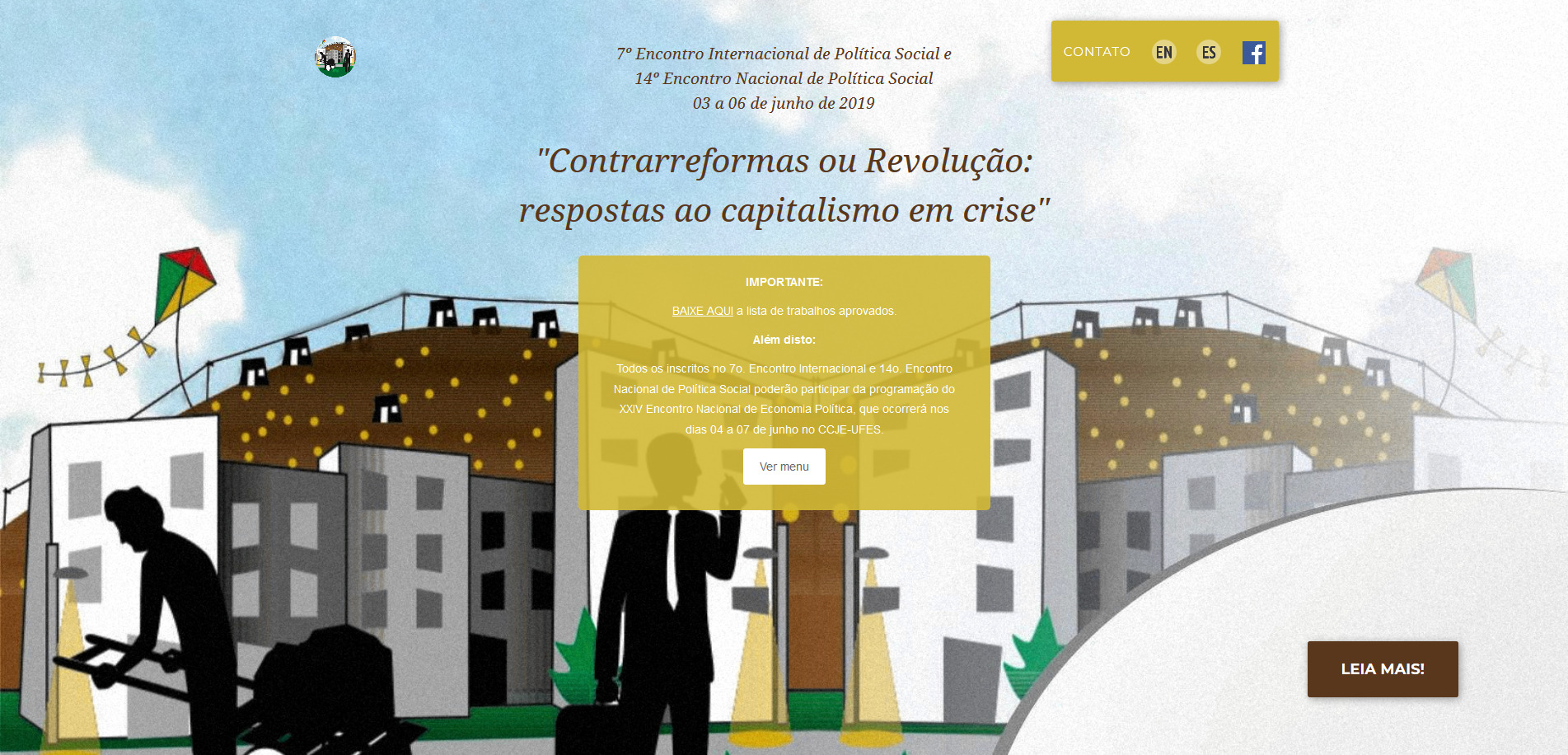 EVENTO No período de 03 e 06 de junho de 2019, a Universidade Federal do Espírito Santo (Vitória/ES) sediará o evento 7º Encontro Internacional de Política Social/14º Encontro Nacional de Política Social promovido pelo Programa de Pós-Graduação em Política Social (PPGPS), vinculado ao Centro de Ciências Jurídicas e Econômicas (CCJE) da Universidade Federal do Espírito Santo (UFES). O tema central desta edição é “CONTRARREFORMAS OU REVOLUÇÃO: RESPOSTAS AO CAPITALISMO EM CRISE“. A programação do evento encontra-se disponível no endereço https://enps.com.br/pagina/programacao.